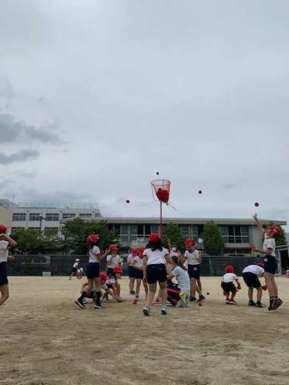 音楽のリズムに合わせて踊り、音楽が変わったら玉入れ「リズム玉入れ」をしています。