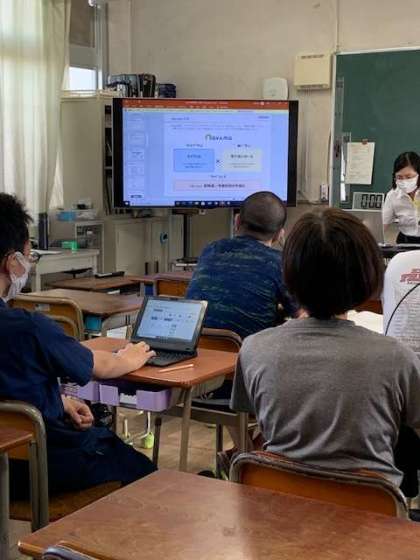 子どもたちが、現在取り組んでいるタブレット端末に入っているアプリ「navima」のより良い使い方について教えてもらっています。