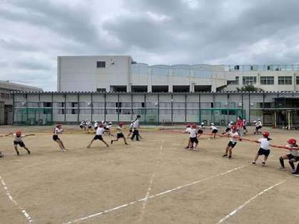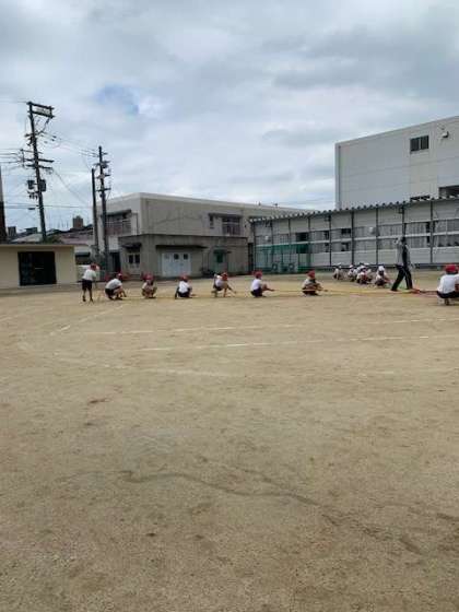 通常は一本だけの綱を引き合うのですが、現在の運動場の広さとソーシャルディスタンスを考えて四方向から引き合うようにしました。