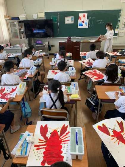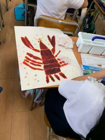 あるクラスでは、ザリガニを描いている途中です。大きく立派なザリガニを描けています。