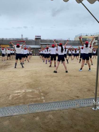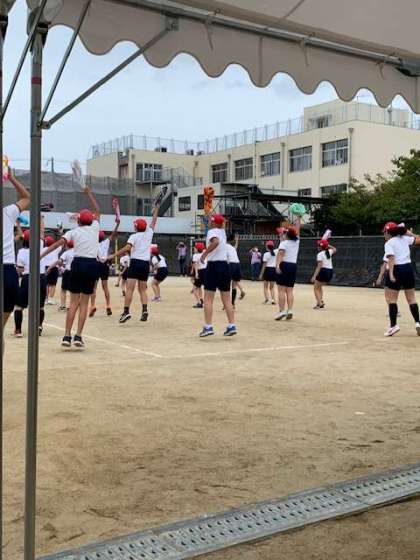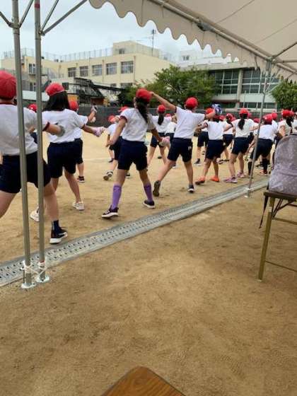 団体演技「三原色」です。これは、タオルダンスと名付けられ、みんな気持ちを合わせて踊ります。