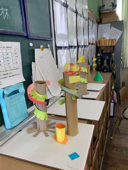 4年生の図画工作科では、コロコロガーレBというビー玉を転がすコース作りに励んでいます。まだまだ製作途中ですが、とっても楽しくなりそうな冒険の道が出来上がってきています。