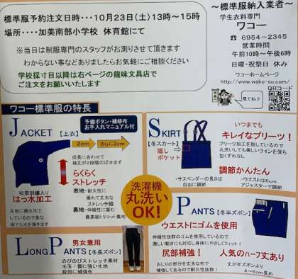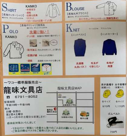 この日がご都合つかない場合は、ワコー標準服販売店である龍味文具店でお買い求めいただけます。