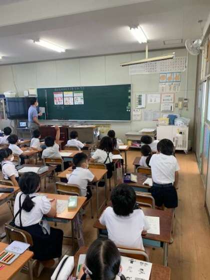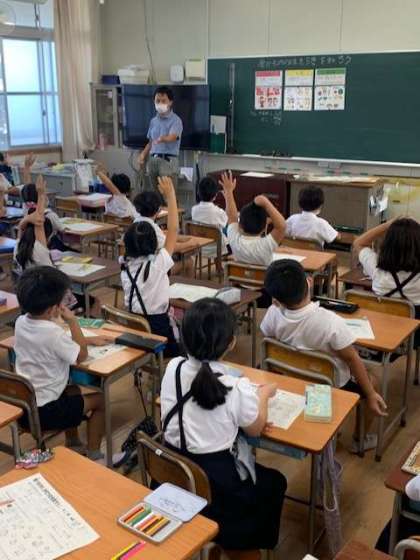 今日は、2年生に栄養教諭が授業しました。「食べもののはたらきを知ろう」と赤(からだをつくるもとになる)、黄色(エネルギーのもとになる)、緑(からだのちょうしをととのえるもとになる)の色に分けて考えます。