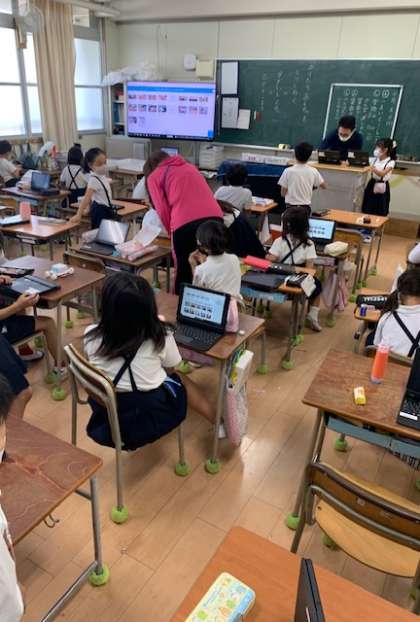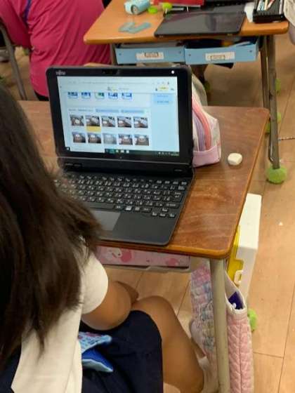 生活科で作った作品をタブレットで写真に撮って、大きな画面に一人一人が映し出していきます。