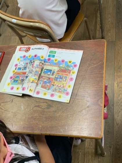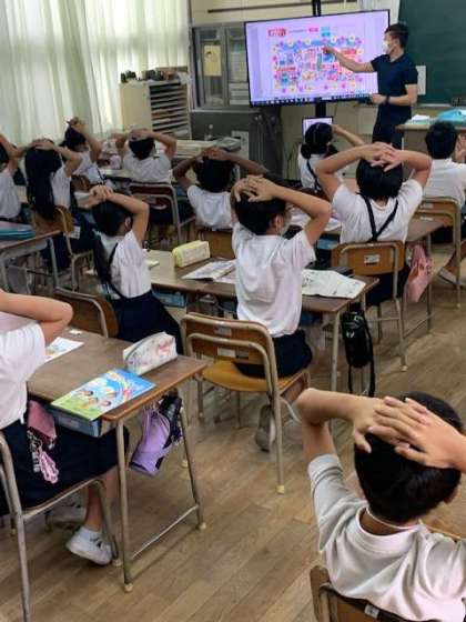 アルファベットの学習です。二人一組になり、手を頭の上に置いて、C-NETの先生の言うアルファベットを先に見つけた方が勝利です。
