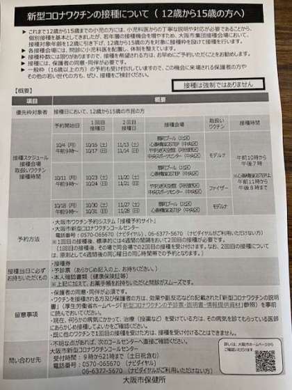 ワクチン接種に関しては、これまで12歳から15歳までの小児の方には、小児科医からの丁寧な説明や対応が必要であることから、個別接種を基本としてきましたが、若年層の接種機会を増やすため、大阪市集団接種会場において、接種対象年齢を12歳に引き下げ、12歳から15歳の方を対象に接種枠を設けて接種を行うこととなりました。