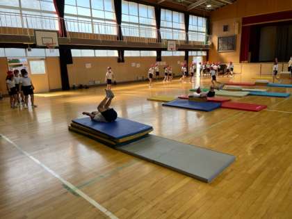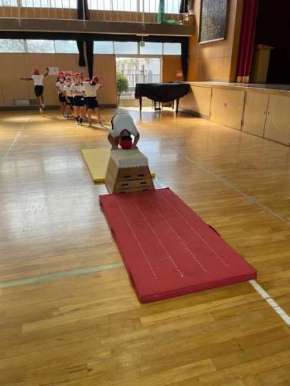 跳び箱の上で回るのがこわい児童もいるので、マットを使って様々な場を設定し、自信がついたらチャレンジします。