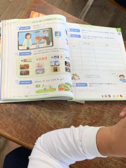 「行きたい国とその理由をたずね合おう」と行きたい国名や食べ物、観光地、有名な人などを学習しています。