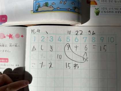 9と1で10を作って、残った5と合わせて15を導き出します。