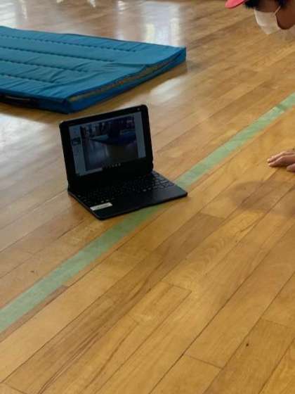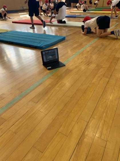 今日の体育は、いつもと少し違います。前転や後転をする前に、見本のお手本動画をタブレット端末で見て、そのあと実演します。した後は、自分の演技が動画に撮られて時間差で流れるので、自分の動きをタブレットで確認します。