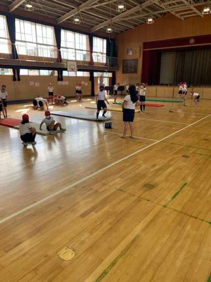 周りで見ている子どもたちも、アドバイスを送り、よりきれいなマット運動ができるようにみんなで取り組んでいます。