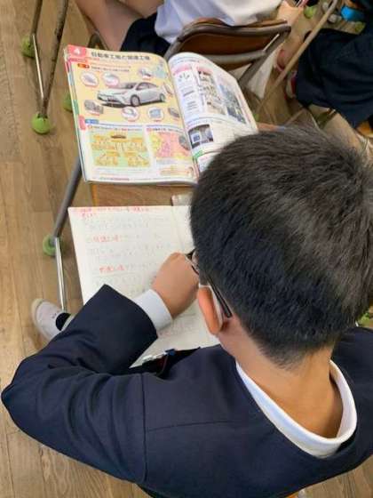 自動車工場と関連工場について、どんな工場があるのかと学んでいます。一台のクルマは、小さいネジまで数えると約3万個の部品からできています。これらの部品は、自動車工場で作るものもありますが、たくさんの協力会社でも分担して作られているということを知りました。