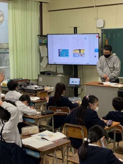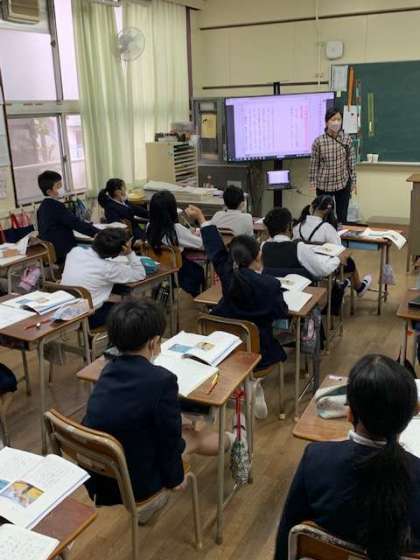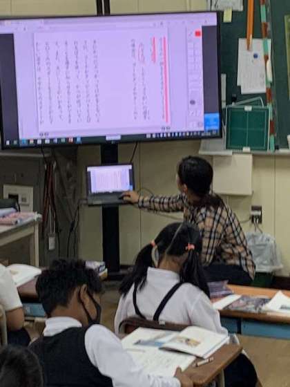 大型モニター画面に担任の先生が、デジタル教科書の書き込みをしていきます。子どもたちの手元にある教科書と同じように線を引いたり、文字を書き込んだりしていきます。
