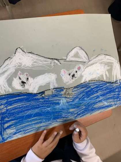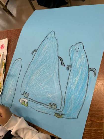 「どうぶつえんを えがこう」遠足に行って見てきた動物を画用紙いっぱいにパスで描いています。子どもたちの目にはこう映っていたのだと私たちも知ることができます。