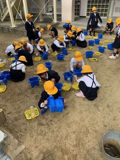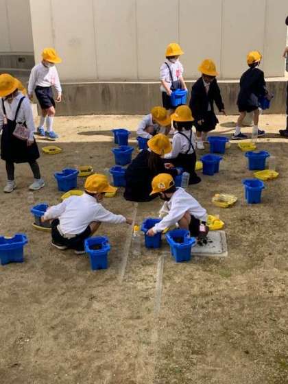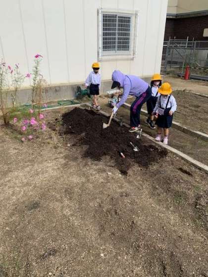 今日は、1年生の残りのクラスがチューリップの球根を植えます。