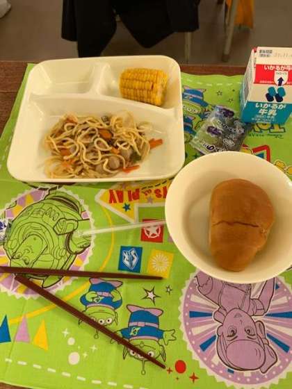今日の給食は、ウインナーときのこの和風スパゲッティ、やきとうもろこし、固形チーズ、パン、牛乳です。