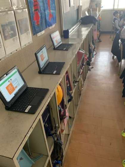 ある教室では、朝来たら子どもたちが触りやすいように、担任の先生がタブレットの電源を入れて用意しています。