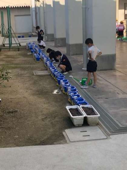 早くから来て、朝の準備が済んだ子どもたちは、チューリップの水やりや朝遊びなどをして過ごしています。