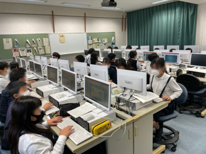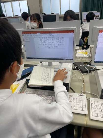 パソコンルームで日本の文化について調べました。「おせち」「百人一首」「お寿司」など、グループで協力して調べ学習です。インターネットから適切な情報を取捨選択するのも大切な学習です。