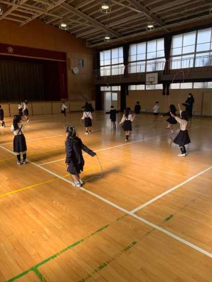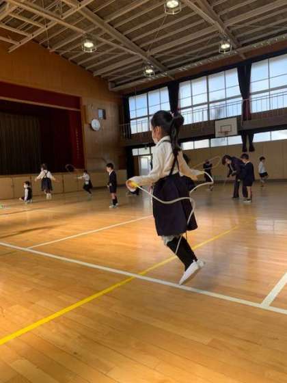 体育館でなわとびの練習をしています。例年であれば、PTAから運動会の参加賞ということで学校で配布していたのですが、幼稚園や保育園で購入している子が多く、今年度の1年生はノートの配布にしました。