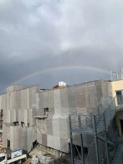 子どもたちも見つけて、「きれい」「写真を撮りたい」と話しています。虹の後ろの空がもう少し青いとよかったのですが、あっと言う間に虹は見えなくなってしまいました。