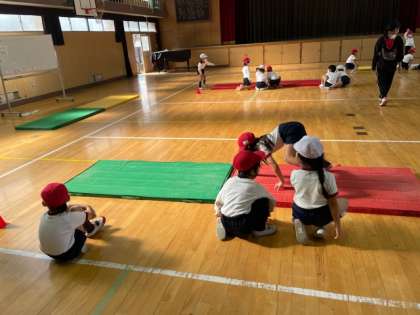 運動場で1組が「走」の運動、体育館で2組がマット運動をしました。