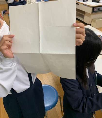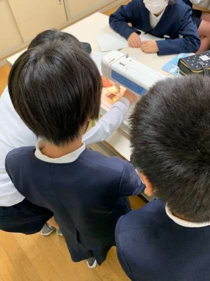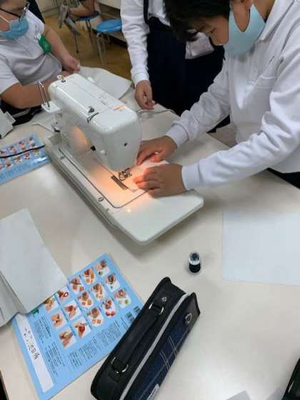 家庭科では、ミシンを使い製作を行います。今日はミシンの使い始めです。慣れるために白い紙に、ミシン針をあてて模様を作って練習です。