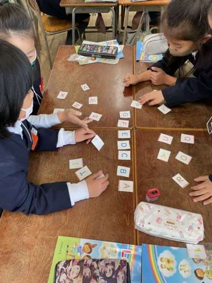 C-NETの先生と一緒にアルファベットの学習です。カードの並べ替え競争をグループ対抗で行い、盛り上がっていました。
