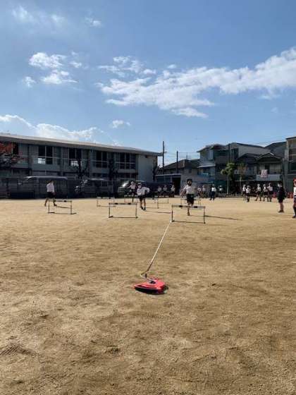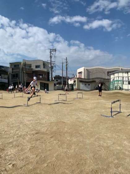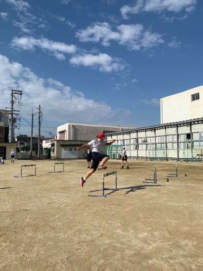 青空の中、ハードル走に取り組んでいます。一人一人が精一杯、自分の力を出そうとすることができていれば授業は成立します。