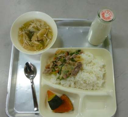 豚丼 すまし汁 焼きかぼちゃ ごはん 牛乳