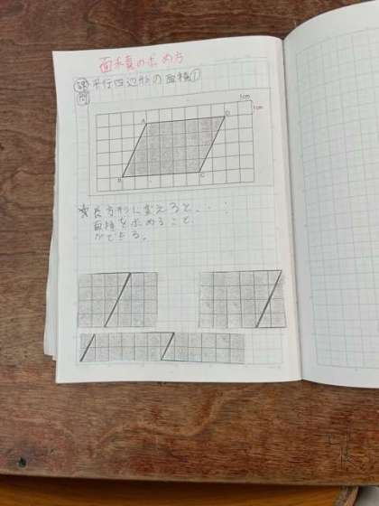 平行四辺形を長方形に等積変換して面積の求め方を考えました。