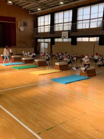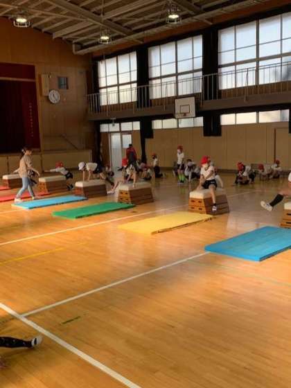 跳び箱の少しでも遠い部分に手をついて、ジャンプします。跳び越えてしまったら、それはそれでOKです。一斉に揃って、ジャンプします。