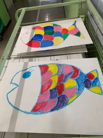 ある学年の図画工作科の作品です。まだ制作途中ですが、きれいな色合いでかわいい魚です。