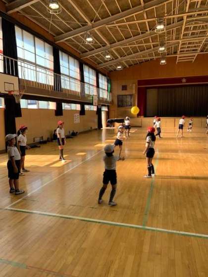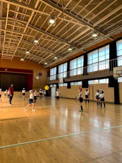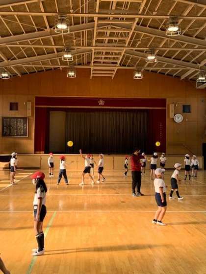 ソフトバレーボールにチームごとに取り組んでいます。落とさずに、1分間ボールを回そうとすると、すぐに落としてしまいます。受け取る相手のことをどれだけ考えて、パスを出せるのかが鍵を握ります。