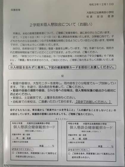 〇明日以降の懇談を予定されているは、忘れずに「健康観察カード」をお持ちください。