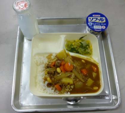 牛肉と大豆のカレーライス レタスのサラダ ヨーグルト 牛乳