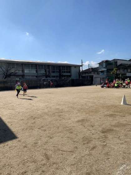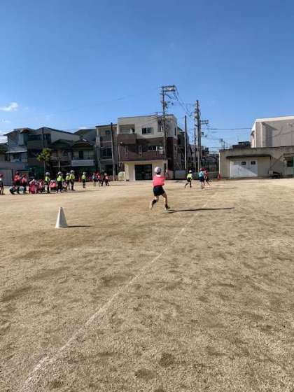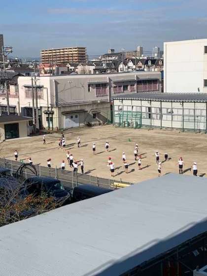 体育館では、1組が跳び箱に取り組んでいます。2組は、運動場でなわとびをしてから、リレーです。陽が当たっていると温かいので、子どもたちも動きやすそうでリレーも白熱しています。