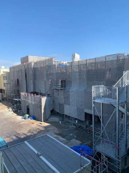 屋上に防水加工も施され、外装の工事も落ち着いてきています。