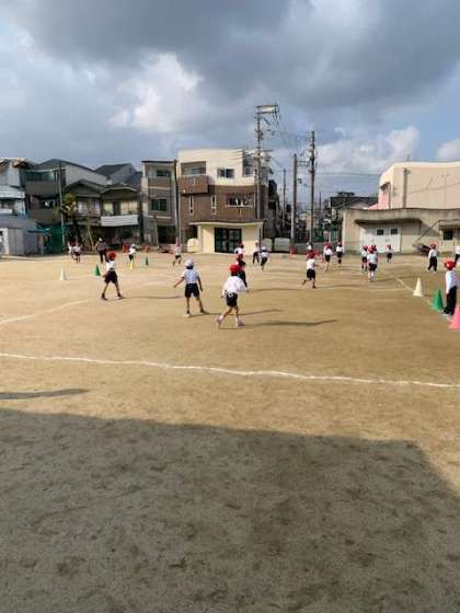 1年生は、なわとびを使ってしっぽ取り鬼ごっこをしています。