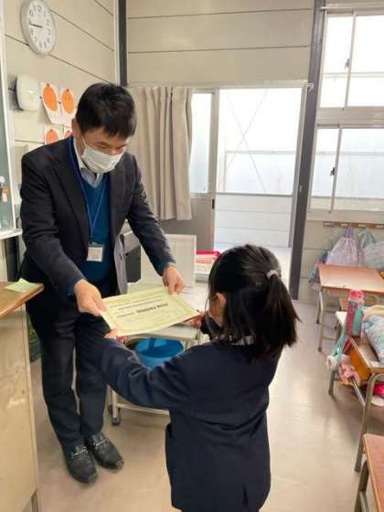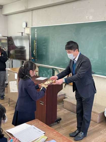 放送による児童朝会で紹介した後、それぞれの教室で表彰状と盾を手渡しました。