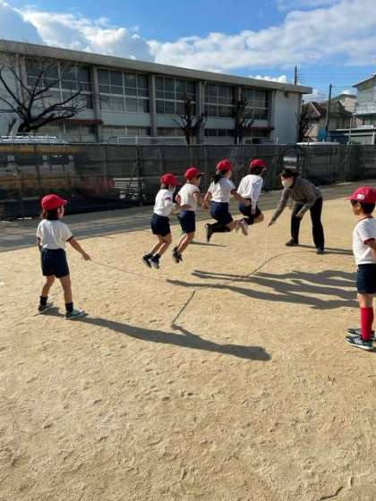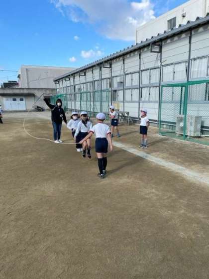 1人ずつ跳んだり、友だちと一緒に跳んだり、走ってくぐり抜けたりするなど、いろいろな跳び方を楽しんでいました。