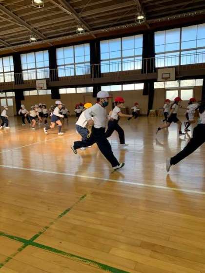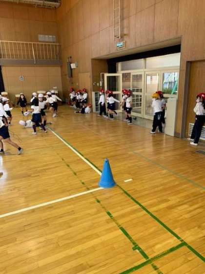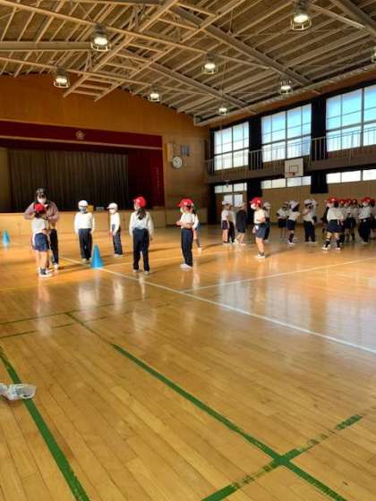 「ねことねずみ」と2グループに分かれて、先生が言った言葉で片方が逃げたら勝ちです。もう片方は、追いかけていき、尻尾のとびなわを取ったら勝ちというゲームです。