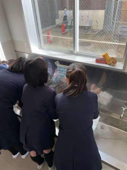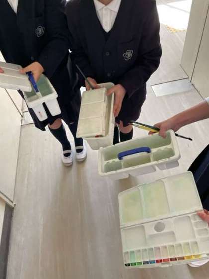 5年生が、図画工作で絵の具を使った後、パレットをきれいに洗っていました。