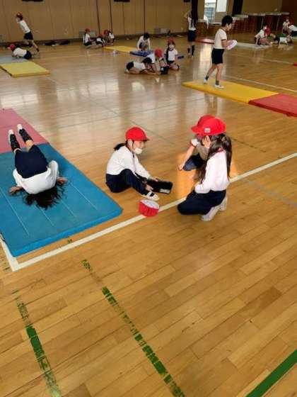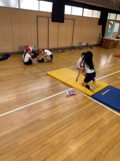 マット運動で「開脚」前転と後転に取り組んでいます。