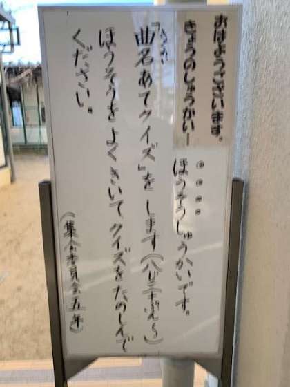 集会委員会が、木曜日は集会をしてくれています。全員で一堂から集まっては難しいので、工夫をして各教室で曲名あてクイズです。