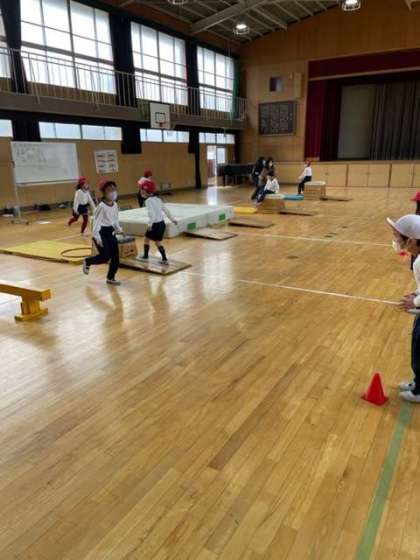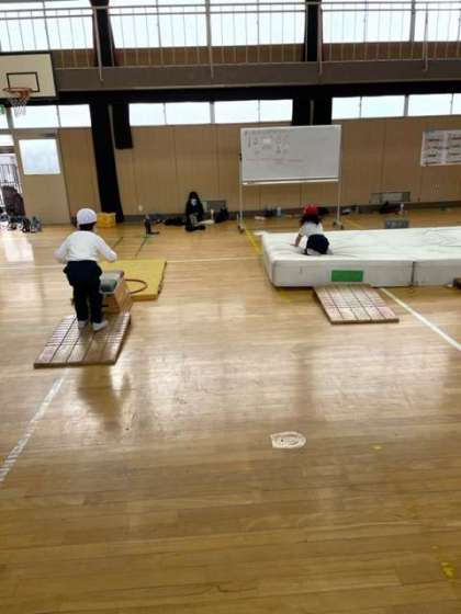 1組は運動場で「ボール運びゲーム」、2組は講堂で「いろんなとび箱あそびをしよう」をしました。