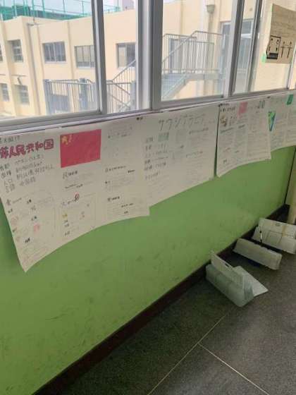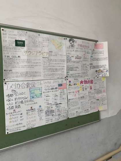 国についてまとめた掲示物です。よく見てみると、必要な情報の他にも、描いた人の好きなキャラクターが登場しるものもあり楽しく読ませてもらいました。
