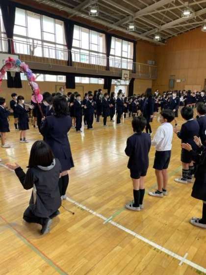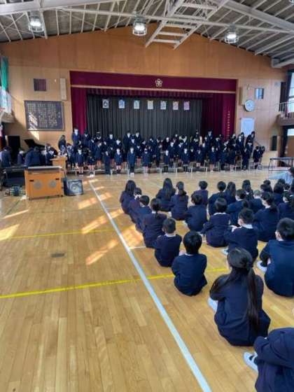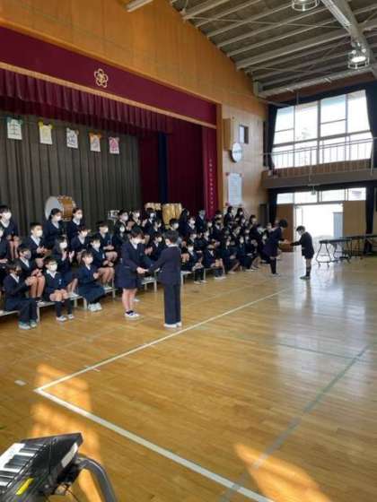 花道の間を通って入場してきた6年生が、ひな壇に座り、在校生からの送別の言葉を聞き、プレゼントの交換を行いました。