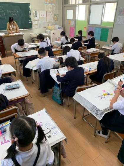 1年間の図画工作科の作品を入れて持ち帰るための、作品袋に思い思いの絵を描いていきます。この作品は袋が、この学年での最後の作品となります。